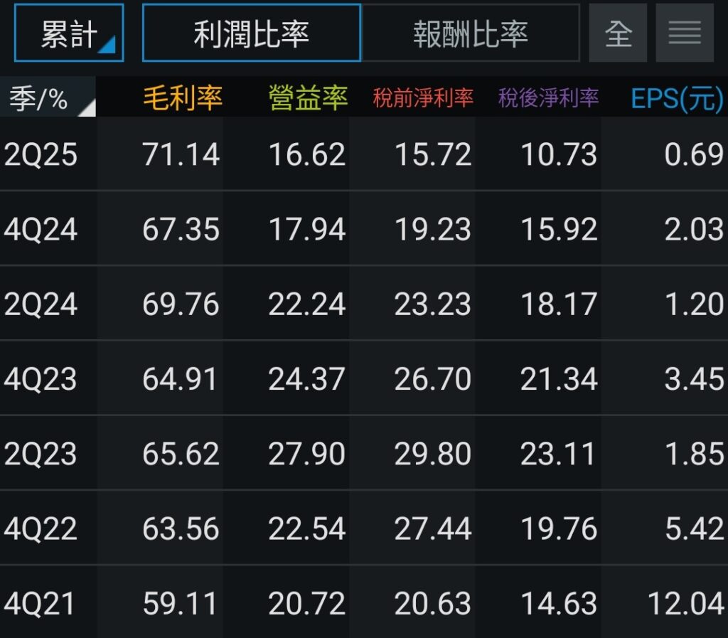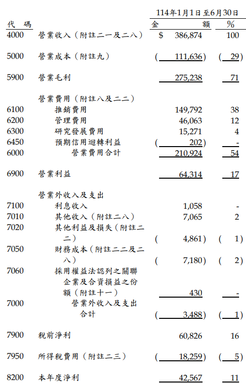 從半年報來看,毛利率71.14%,為歷史新高,不過由於推銷費用大增,再加上匯損,導致稅後淨利下滑,上半年EPS為0.69元。 以下截取自114半年報與三竹股市APP