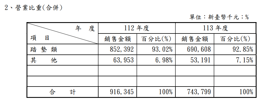 公司所營業務之主要內容為售後市場汽車配件、車廠標配和選配的汽車配件、戶外休閒用品、寵物用品、汽車百貨用品,而踏墊類的比重在2024年佔比92.85%。以下截取自113年報