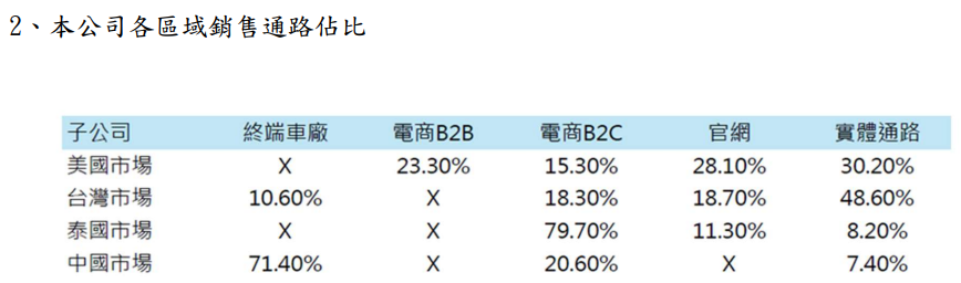公司銷售通路包含終端車廠(ODM)、代理商(Distributor )、自己銷售(B2B、B2C)等多元方式;依B2B/B2C佔比:目前是以B2B為主,佔比約62%。依供應鏈模式:本公司的3D品牌及知名度很高,故OBM佔比高達88%。ODM/OEM佔12%,因此毛利率可以較一般車用配件同業高。依集團整體來看:終端車廠佔12%、海外經銷商佔11%、自己銷售B2B佔39%、自行銷B2C佔38%,而從各區域市場來看會有所差異: