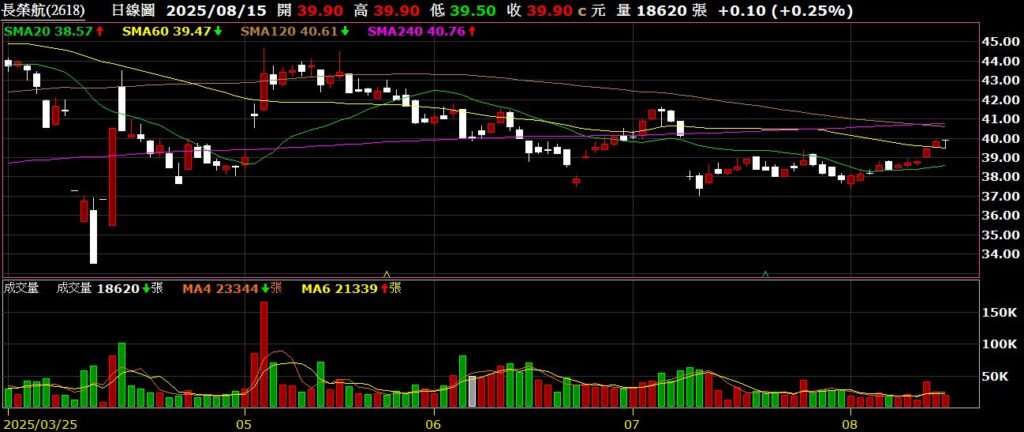 長榮航(2618)航空公司,Q2 EPS為1.24元,毛利率為25.28%,營業利益率為18.83%,股價持續反彈,重新站回季線