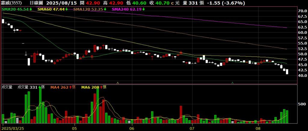 嘉威(3557)生活餐具大廠,Q2 EPS為-1.47元,毛利率為32.7%,營業利益率為-8.35%,關稅加上匯損衝擊,股價創波段新低