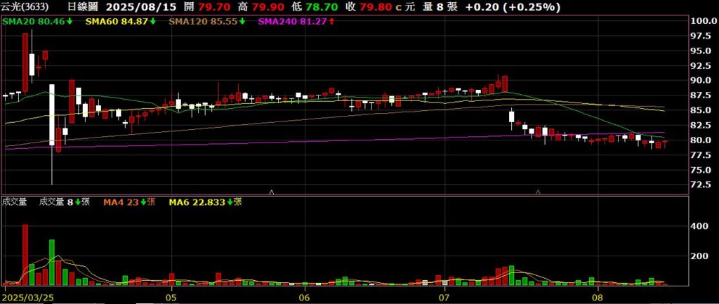云光(3633)背光模組廠,上半年EPS為4.22元,毛利率為13.39%,創歷史新高,股價持續橫盤整理