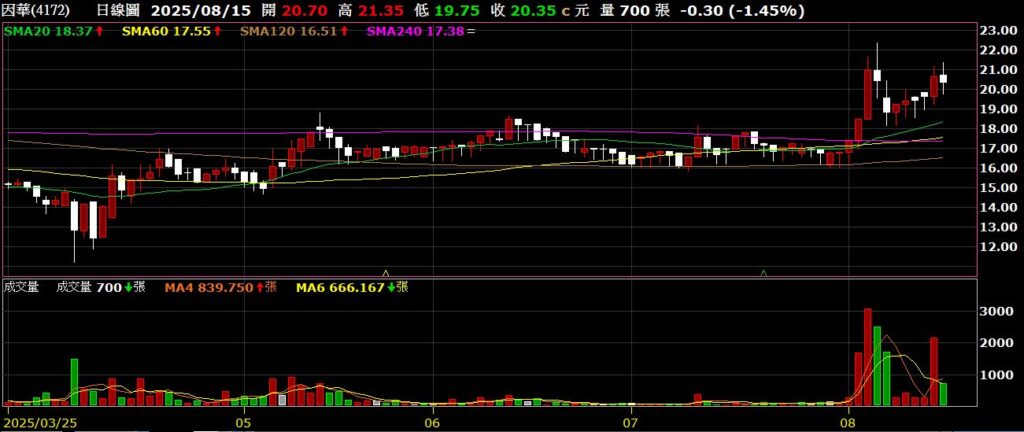 因華(4172)興櫃新藥股,七月營收為377萬,連續五個月有營收挹注,股價蓄勢挑戰八月初高點