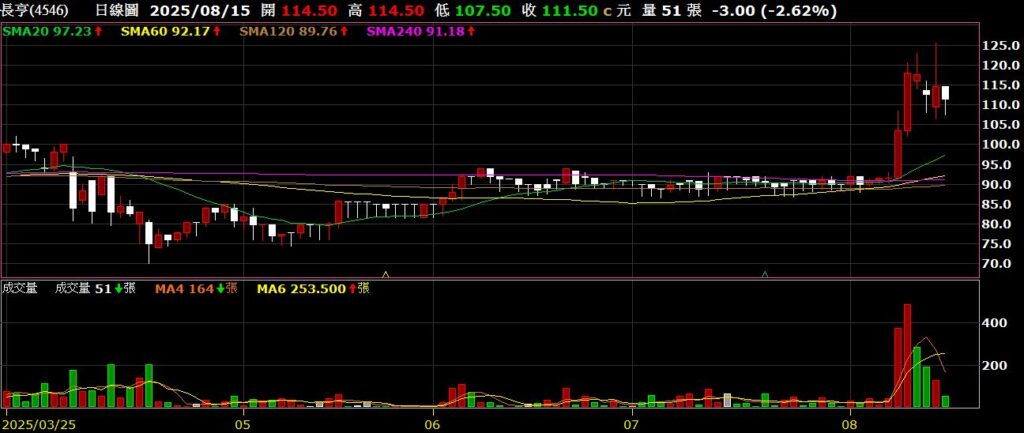 長亨(4546)飛機引擎零組件製造商,上半年EPS為2.13元,毛利率為27.7%,營業利益率為14.97%,股價最高來到125.5,創下波段新高