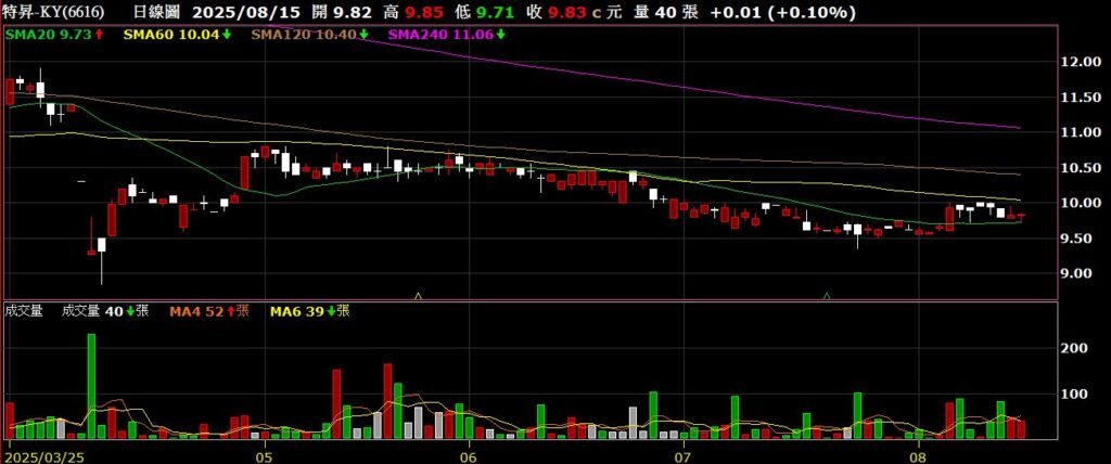 特昇-KY(6616)家具製造商,七月營收為9316萬,年增27.94%,為近四個月以來新高,股價橫盤整理