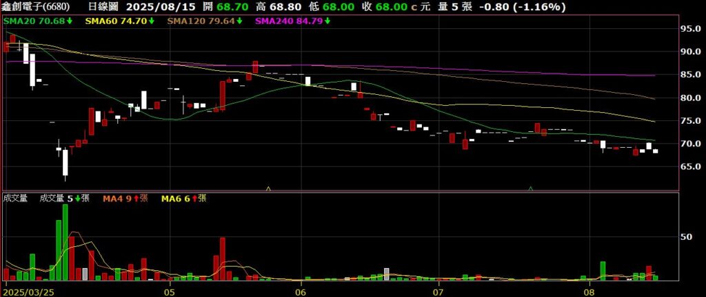 鑫創電子(6680)主要業務為智能車載電腦與嵌入式電腦,Q2 EPS為-1.19元,七月營收為3449萬,年減20.03%,股價低檔整理