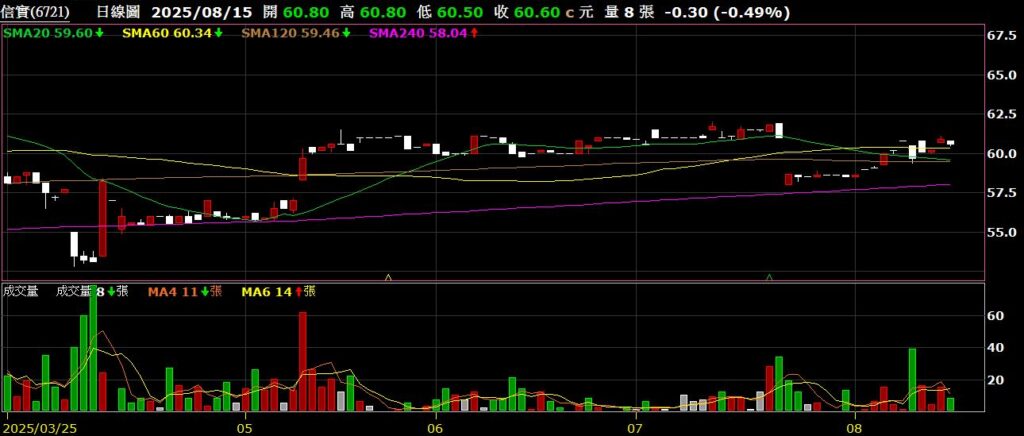 信實(6721)清潔保全公司,信實(6721)清潔保全公司,七月營收為3.13億,年增13.38%,創歷史新高,股價橫盤整理