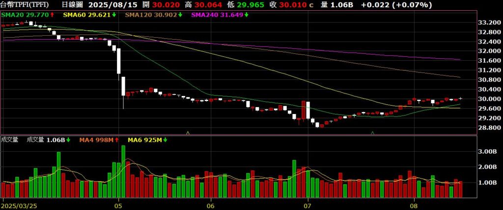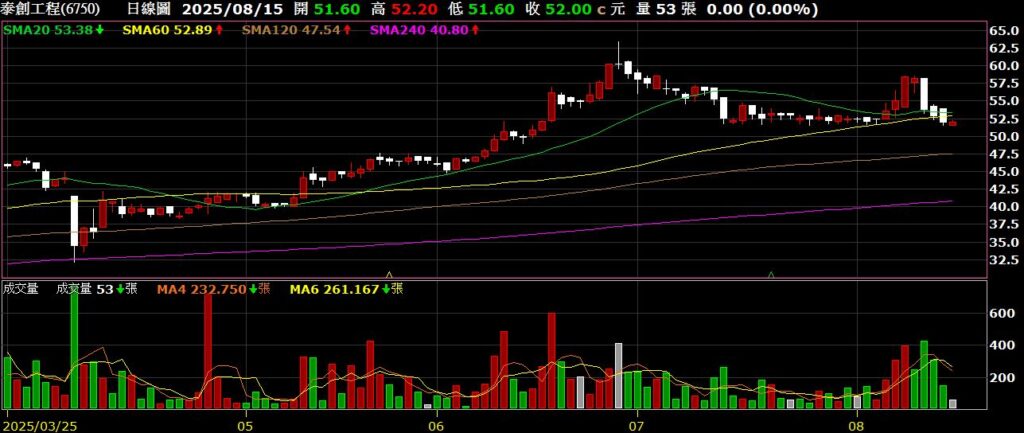 泰創(6750)無塵室與太陽能工程概念股,上半年EPS為2.02元,毛利率為13.05%,七月營收為3.55億,年增13.47%,不如市場預期,股價跌破月季線