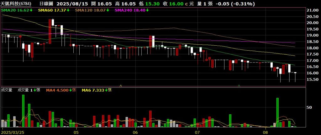 天凱(6784)主要有天線、穿戴裝置與車用電子三大業務,上半年EPS為-0.31元,七月營收為3459萬,年增25.81%,股價持續低檔整理