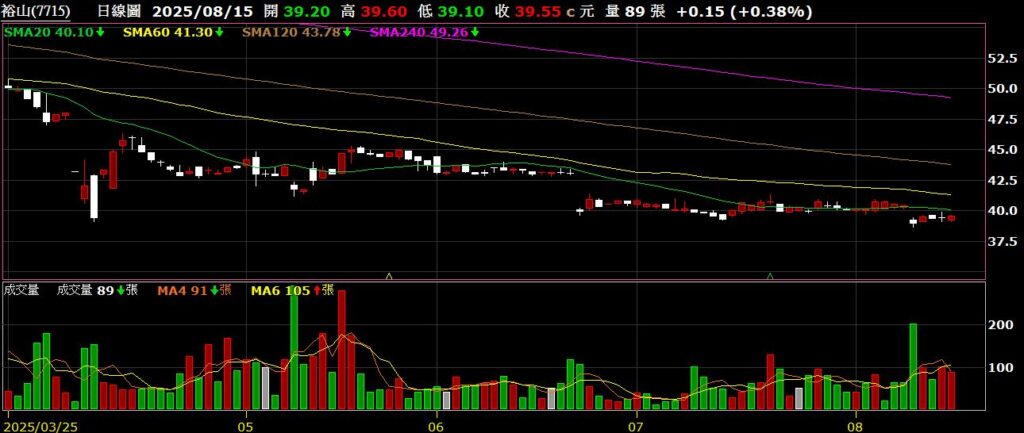 裕山(7715)環境工程公司,Q2 EPS為0.93元,毛利率為19.96%,營業利益率為7.78%,股價跌破月線