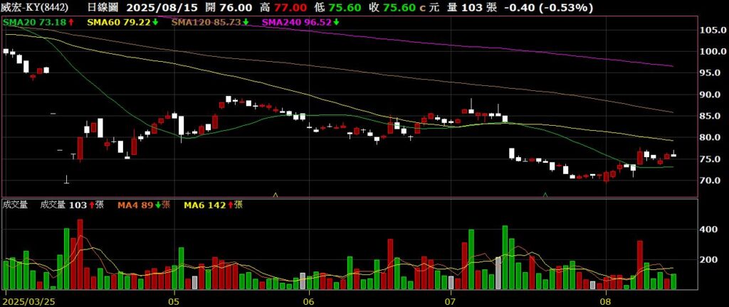 威宏-KY(8442)運動裝備及精品包袋製造商,Q2 EPS為0.03元,毛利率為19.11%,營業利益率為8.22%,不過業外損失約兩元,股價月線附近橫盤整理