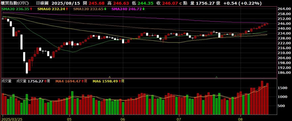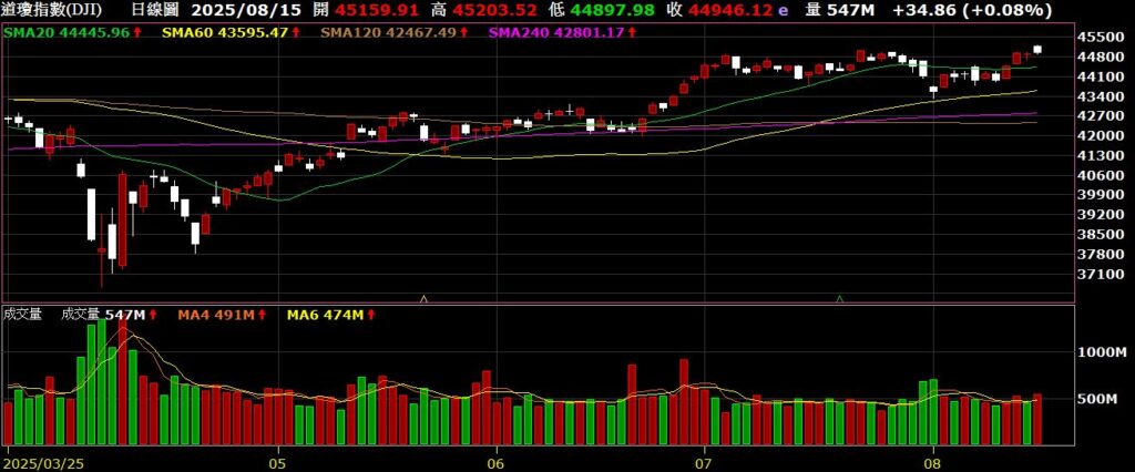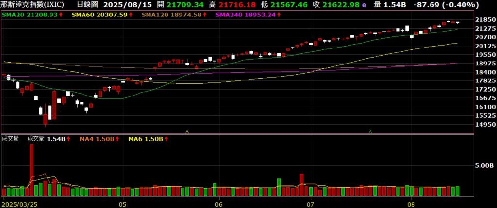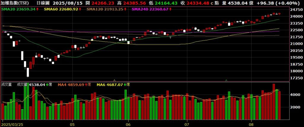 觀察美國四大指數,上週除了費半指數外,其餘三大指數均創下歷史新高,多頭十分強勁;上週美國勞工部公布七月份CPI年增率為2.7%,低於市場預期的2.8%,公布後,四大指數齊揚;關稅的議題持續進行,川普趕在8月12前壓線簽行政命令,將美中關稅休戰期再延長90天至11月中旬,雙方持續溝通;美國上週初領失業金人數為22.4萬,優於市場預期的22.9萬,顯示雇主仍不願意裁減員工,不過續領人數依舊維持在2021年11月以來的高檔徘徊;從FED watch觀察,九月降息的機率為92.1%,十月降息的機率為96.8%。以下資訊擷取自XQ操盤高手。
