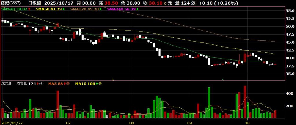 嘉威(3557)生活餐具大廠,九月營收為2.06億,年減40.04%,股價回測前低