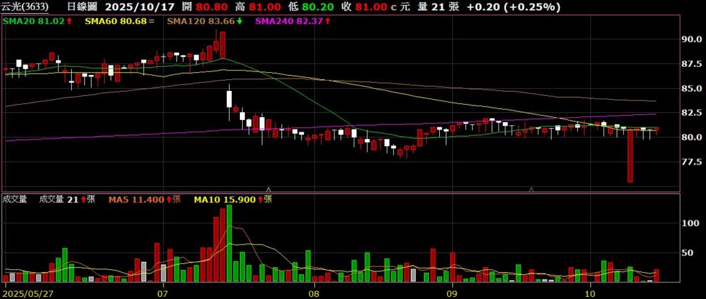 云光(3633)背光模組廠,九月營收為4.17億,年減22.63%,股價沿著月線橫盤整理