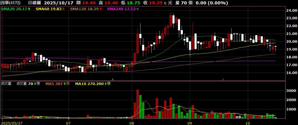 因華(4172)興櫃新藥股,九月營收為568萬,連續七個月有營收挹注,股價回測半年線