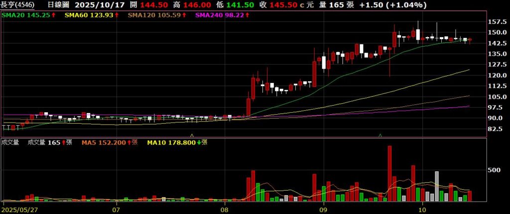 長亨(4546)飛機引擎零組件製造商,九月營收為1.81億,年增111.71%,股價高檔橫盤整理