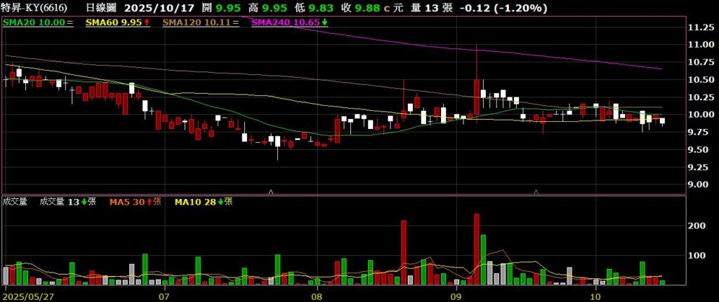 特昇-KY(6616)家具製造商,九月營收為7657萬,年減26.67%,股價沿著季線整理