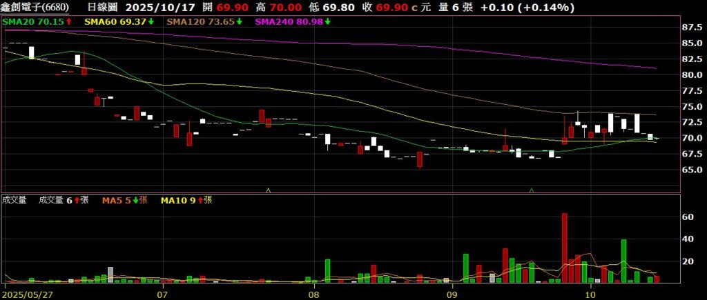 鑫創電子(6680)主要業務為智能車載電腦與嵌入式電腦,九月營收為6511萬,年減17.27%,創去年11月來新高,股價回測季線