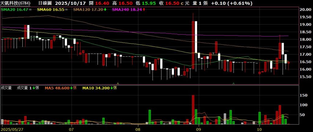 天凱(6784)主要有天線、穿戴裝置與車用電子三大業務,九月營收為3866萬,年增155.71%,股價挑戰年線失敗後拉回