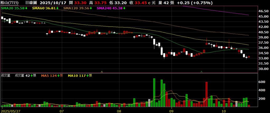 裕山(7715)環境工程公司,九月營收為6133萬,年減56.9%,股價回測前低
