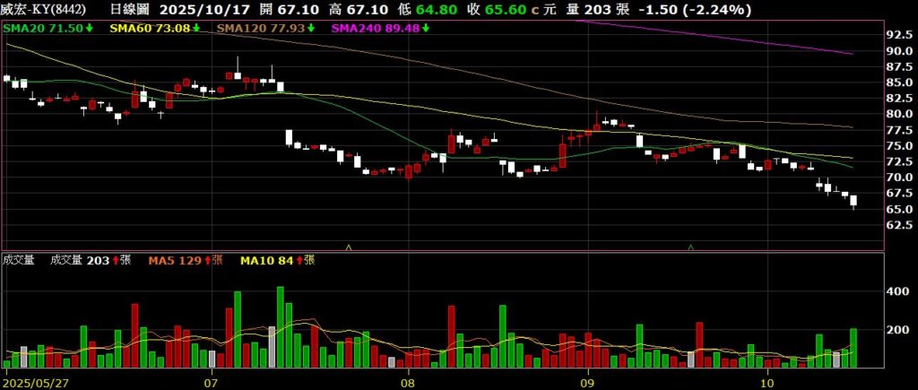 威宏-KY(8442)運動裝備及精品包袋製造商,九月營收為5.85億,年減14.52%,股價跌破前低