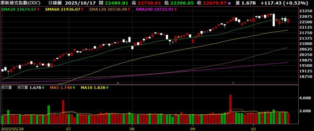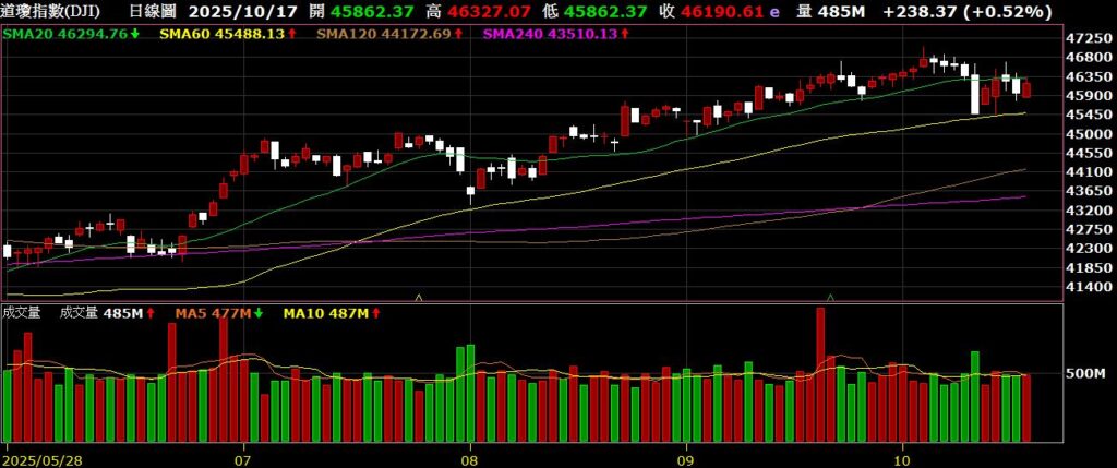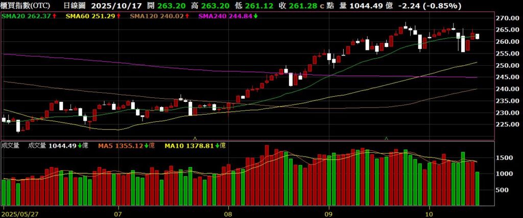 觀察美國四大指數,上週全數維持高檔整理;上週美中貿易戰再升級,中國在10月9日宣布自12月1日起擴大稀土出口管制,川普也立刻回擊,宣布對中國商品加徵100%關稅,消息一出四大指數應聲重挫,不過隔天川普又稱,美國想幫中國,不是要傷害它,四大指數隨即大漲回應,隨後美國財政部長貝森特也表示,若北京放棄最新稀土出口管制計畫,美方願延長對中國商品高關稅的暫停期限;上週FED主席鮑爾暗示,儘管通膨持續膠著,但就業市場已現疲態,FED仍可能在本月底再次降息,同時暗示可能在未來幾個月停止縮減資產負債表,也激勵是四大指數反彈;由於政府持續停擺,一些經濟數據也將延後公布;從FED watch觀察,十月降息的機率為100%,12月降息兩碼以上的機率為100%。以下資訊擷取自XQ操盤高手。
