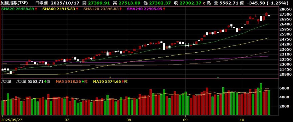 上週台股再度經歷川普的關稅利空洗禮,不過這次市場的恐慌程度明顯下降,原先市場預期可能周一開盤會下跌1500點,結果最多也才下跌831點,終場僅小跌378點,市場對於川普的關稅利空,反應鈍化,週四更是在台積電的帶動下,再度創下歷史新高;上週公佈上市櫃九月營收一舉衝上4.69兆元新高,月增12.92%,年增14.87%,單季營收衝上12.91兆,以及前三季36.44兆元,皆創歷史同期新高;籌碼面來看,上週外資賣超976億,連兩周賣超;期貨的部分,空單小減至25586口,十大交易人空單也同步小減至1671口,大盤小漲,法人期貨空單部位同步減少;融資餘額來看,上週融資小減5億,為2851億,融券的部分小減3378張,至32.5萬張左右,資券同減;技術面來看,單週小漲1點,周線連八漲,指數最高來到27732,再創歷史新高,週二在創高後隨即拉回,從上漲到翻黑,高低落差734點,成交量也爆出7027億的大量,看似要拉回整理的K線,在週四再度過高,顯示市場的多頭相當強勁,接下來隨時要挑戰兩萬八。以下資訊擷取自XQ操盤高手
