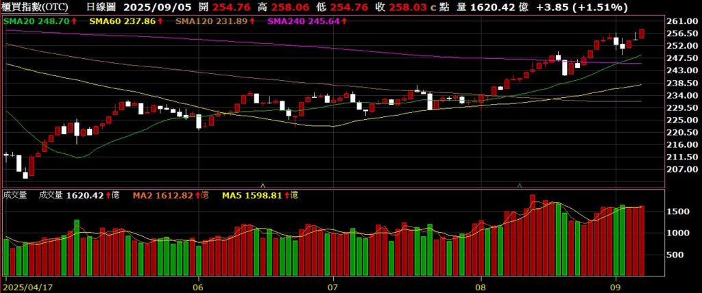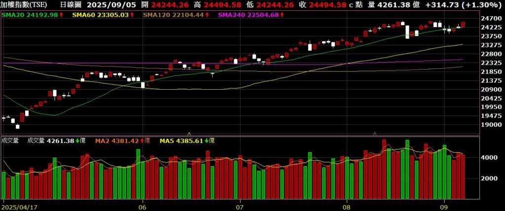 上週中經院公布八月台灣製造業PMI為47.9,創2024年四月以來新低,中經院指出,製造業等待對等關稅談判細節,並觀望232條款半導體與鋼鋁相關施行細則,使新增訂單、生產分別連續五個和三個月緊縮,惟原物料價格指數已連續11個月上升, 中經院院長分析,不排除觀望氣氛延續至年底;台經院公布七月製造業景氣信號值,較上個月減少1.38分至8.48分,連續亮第三顆藍燈,且有87%的廠商亮藍燈,顯示市場觀望貿易談判結果,使製造業廠商看好未來半年景氣者較上月明顯減少;籌碼面來看,上週外資買超478億,終止連三周賣超;期貨的部分,空單小減至21304口,十大交易人空單轉為多單258口,大盤小漲,法人期貨空單部位小幅減少;融資餘額來看,上週融資小增21億,為2644億,融券的部分小減3846張,至28.3萬張左右,資增券減;技術面來看,單週小漲261點,周線連二紅,指數上半週連續三天向下測試24000的支撐,周五再來一根紅棒直逼前高,成交量也未出現爆量,日KD開始出現高檔鈍化,目前多頭氣勢強勁,下週隨時有機會再度挑戰歷史高點。以下資訊擷取自XQ操盤高手