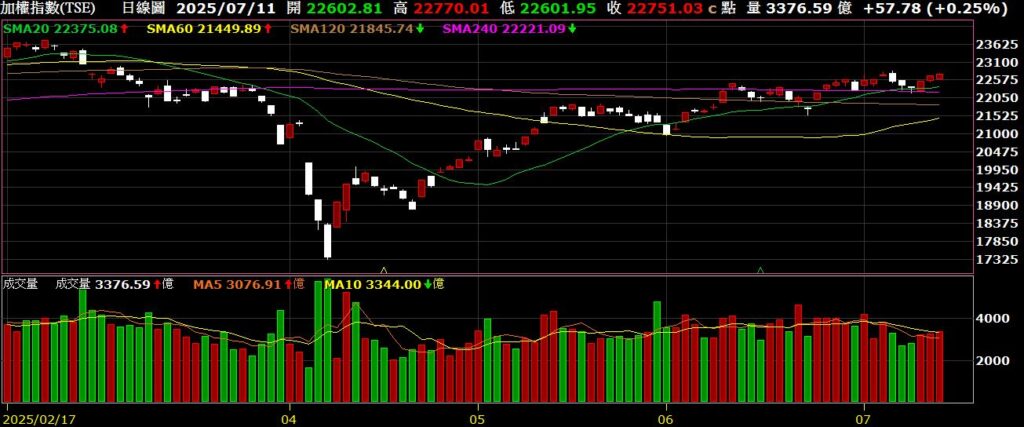 上週財政部公布六月出口金額為533.2億美元,月增3.1%、年增33.7%,再創歷年單月出口新高,連續第20 個月年增率維持正成長,主要受惠於新興科技應用需求強勁與美國對等關稅暫緩實施的備貨效應推升,財政部也預估提前拉貨效應可望持續,樂觀看待七月出口;籌碼面來看,上週外資買超291億,連三周買超;期貨的部分,空單小增至57492口,十大交易人則是空單小增至732口,大盤小漲,法人期貨部位同步偏空;融資餘額來看,上週融資小增3億,為2240億,融券的部分小增42506張,至27.7萬張左右,資券同增;技術面來看,單週小漲203點,周線轉紅,雖然指數緩步往上墊高,不過成交量卻開始萎縮,開始有些價量背離,接下來有可能會出現技術性修正。以下資訊擷取自XQ操盤高手