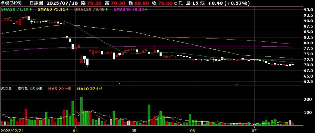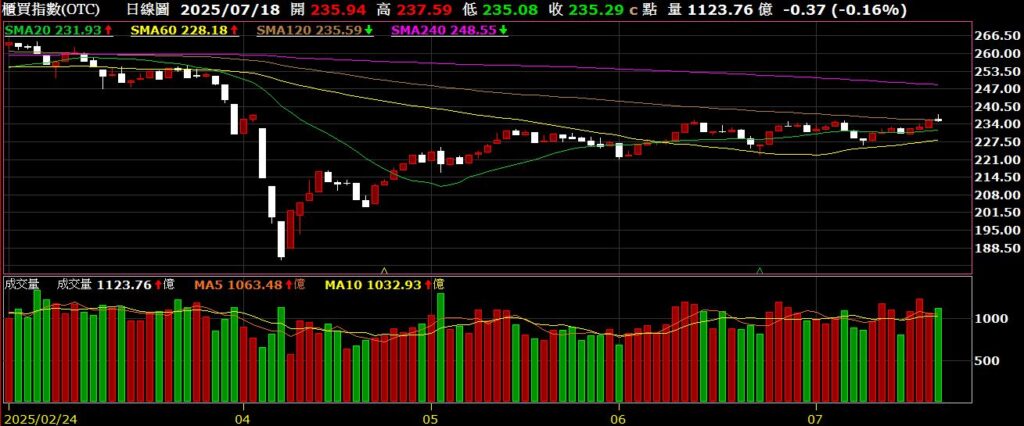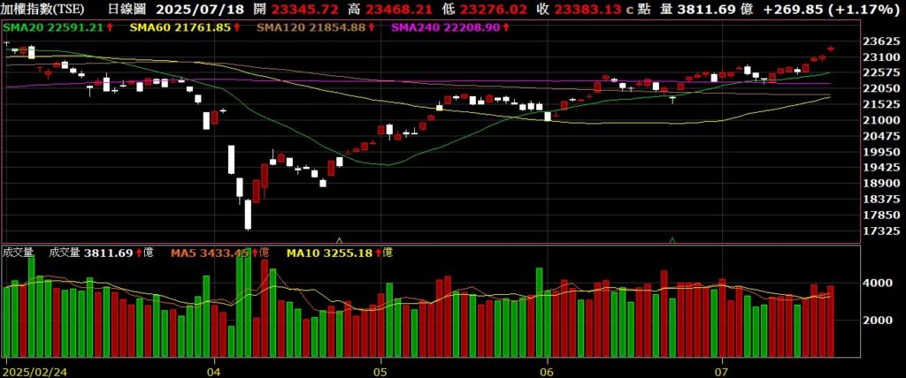 回到個股上面來,上週台積電召開第二季法說會,會中公布第二季財報,第二季營收年增38.6%,毛利率為58.6%,營業利益率為49.6%,EPS為15.36元,達財測預期的高標,財報利多也激勵股價單周上漲5%,也讓市場資金流往權值股流入,中小型股的表現相對受限;上週川普宣布美國將對印尼徵收19%的關稅,印尼則全面開放市場,並且承諾購買50架波音飛機,這波關稅戰也讓波音收穫了不少新訂單,股價也從4/7的低點128.88最高來到233.61,也讓相關供應鏈的長亨未來的業績有了想像空間;週五裕山一則新聞【裕山取得三大專案約9億元 看好推升營運動能】,內文提到公司於近期陸續取得業務案件約9億,所以除了四、五月份取得的3.98億之外,又有其他的案件得標,另外也成功取得高雄市政府的高雄市仁武推動廢棄物資源化設施促參BOT案第一階段評選的第一順位資格,此案為高雄市垃圾處理設施的重大建設,採BOT模式,於本月17日召開公聽會,預計於2026年正式開標,裕山表示,此案若順利得標,將帶來每年約2億元以上營收;上週華豫寧除息,開始慢慢填息,但云光及威宏-KY則是處於貼息;上週裕山股息入帳,小幅加碼威宏-KY。以下資訊擷取自XQ操盤高手。
