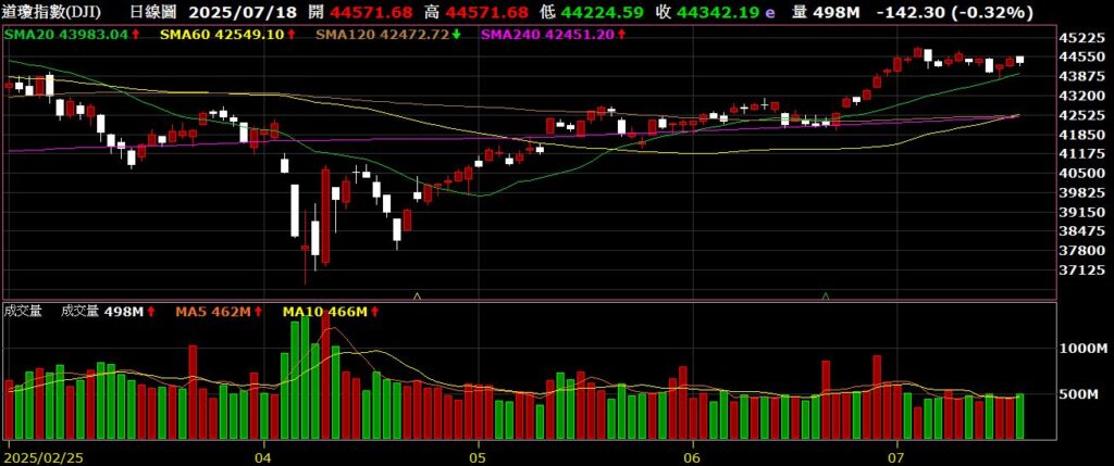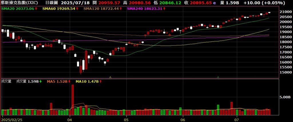 觀察美國四大指數,上週在輝達創下歷史新高的帶動下,標普500與那斯達克持續創下歷史新高,費半也持續在緩步墊高;上週美國公佈六月CPI年增2.7%,符合市場預期,而核心CPI年增2.9%,則是低於市場預期的3%,而市場預期聯準會七月底降息機率極小;上週輝達宣布即將恢復向中國銷售H20晶片,消息一出,輝達股價上漲4.04%,再創歷史新高;美國上週初領失業金人數為22.1萬,低於市場預期的23.3萬,創下三個月以來新低,不過持續申請人數仍維持在2021年11月以來的高點;從FED watch觀察,七月降息的機率為4.7%,九月降息的機率為60.7%。以下資訊擷取自XQ操盤高手。