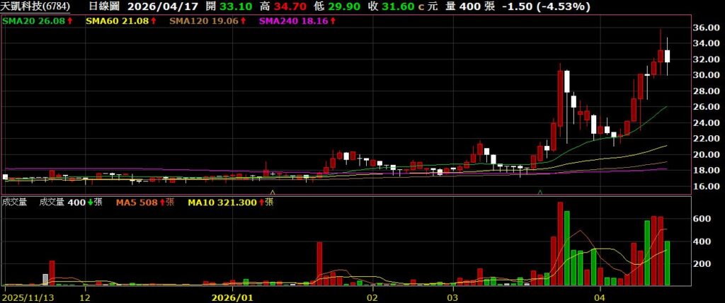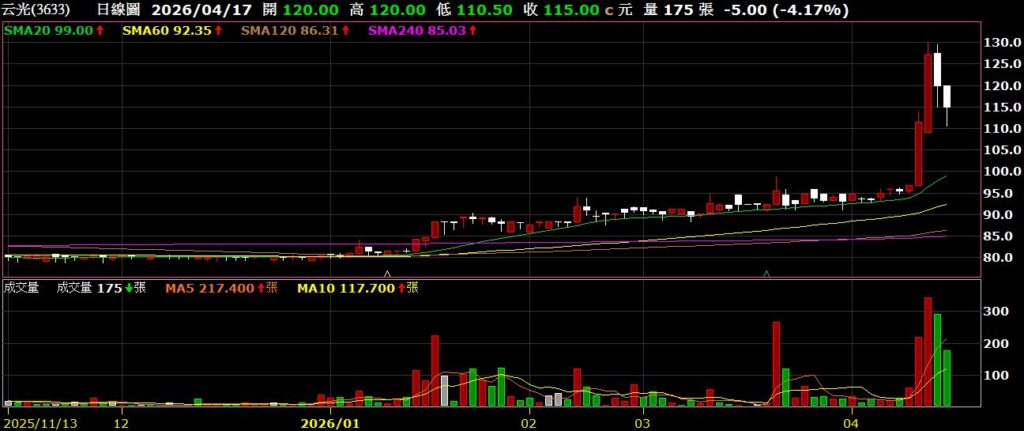 回到個股上面來,上週在熱錢簇擁下,股王信驊再度創下歷史天價,最高來到14890,股后穎崴也首度破萬,最高來到10675,台股首見兩萬金股,台積電也同步創下歷史新高,最高來到2100,市場上千金股也來到45家,資金也外溢到了興櫃市場,興櫃周漲幅超過一倍的股票就有七檔,多頭四處點火;上週手上的興櫃持股也是受到市場點火,云光周漲幅20.42%,最高來到130,去年EPS為10.48元,今年若維持一到三月的成長態勢,估計全年EPS至少12元起跳,目前價位來看本益比仍低;長亨周漲幅9.84%,最高來到149.5,隨時挑戰去年九月的高點158;天凱周漲幅17.04%,最高來到35.75,持續創波段新高;因華周漲幅8.99%;聖州周漲幅10.78%;上週持股無動作。以下資訊擷取自XQ操盤高手。