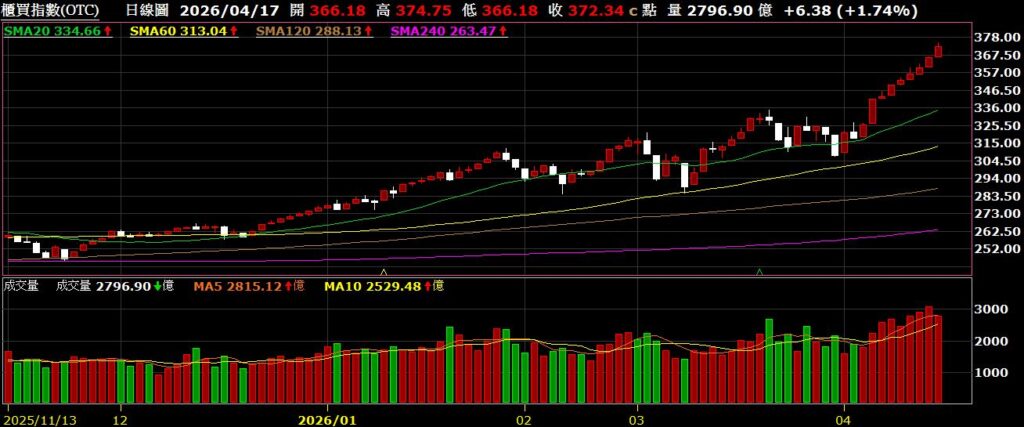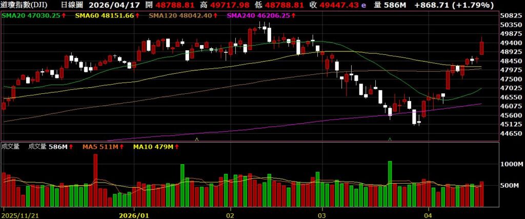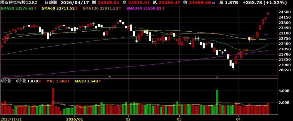 觀察美國四大指數,上週在戰事緩和下,除了道瓊指數外,其餘三大指數皆創歷史新高;上週美國總統川普在白宮外受訪時表示,美國與伊朗可能於本周末展開談判,並稱雙方非常接近達成協議,他同時指出,伊朗已同意交出高度濃縮鈾,並指出若有需要,願意延長與伊朗之間為期兩周的停火,而由於以色列與黎巴嫩達成為期十天停火協議後,伊朗也宣布荷姆茲海峽於停火期間全面開放,供商業船隻通行,戰事淡化下,油價大跌,全球股市齊漲;上週ASML公布上季財報,營收87.7億歐元,高於市場預期的86.9億歐元,毛利率53%,同樣也優於市場預估的52.2%,展望未來,預估第二季淨銷售額將落在84億至90億歐元之間,中值約87億歐元,低於市場預期的90.7億歐元;毛利率預期為51%至52%,亦較第一季略為下滑,不過上調全年財測,預估全年淨銷售額將達360億至400億歐元,高於先前預期的340億至390億歐元,公布號,股價單周下跌1.25%;美國上週初領失業金人數為20.7萬,高於市場預期的21.5萬,顯示就業市場仍維持穩定,企業裁員規模有限;從FED watch觀察,四月升息一碼的機率為2.1%。以下資訊擷取自XQ操盤高手。