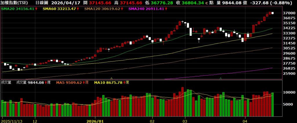 上週台股再創歷史新高,台股市值破4.1兆美元,超越英國躍居全球第7大市場,全體上市公司營收總計4兆9291億元,較去年同期成長33.91%,全體上櫃公司營收3203億,較去年同期成長22%,這波的上漲也算是反應基本面的成長;籌碼面來看,上週外資買超1504億,連兩周買超;期貨的部分,空單小增至41151口,十大交易人多單小減至2877口,大盤小漲,法人期貨空單小幅增加;融資餘額來看,上週融資小增259億,為4271億,融券的部分小增36425張,至18.3萬張左右,資券同增;技術面來看,單週小漲1386點,周線連二紅,大盤持續創新高,指數最高來到37145,櫃買指數也持續創下歷史新高,多頭上檔沒有壓力,只剩下獲利了結賣與漲多的的技術性修正。以下資訊擷取自XQ操盤高手