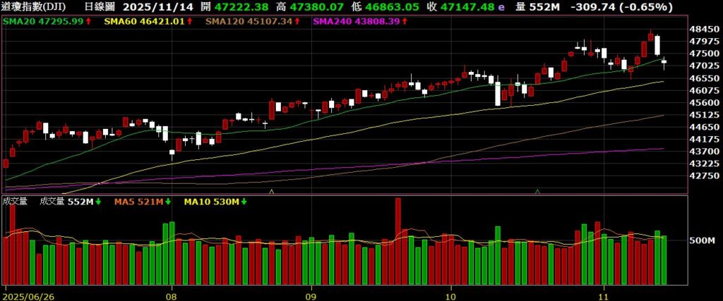 觀察美國四大指數,上週出現拉回修正,不過道瓊指數仍再度創下歷史新高;上週美國政府結束史上最長的43天關門,這次政府關門不僅是美國歷史上最長,每週造成150億美元損失,共有約6萬名非聯邦政府員工失去工作,不過結束關門後利多出盡,四大指數拉回;上週思科公布上季財報,營收148.8億美元,高於市場預測的147.7億美元,EPS為1美元,同樣高於市場預測的0.98美元,財測方面也同樣優於市場預期,公布後股價上漲4.62%;從FED watch觀察,12月降息一碼的機率下降為44.4%。以下資訊擷取自XQ操盤高手。