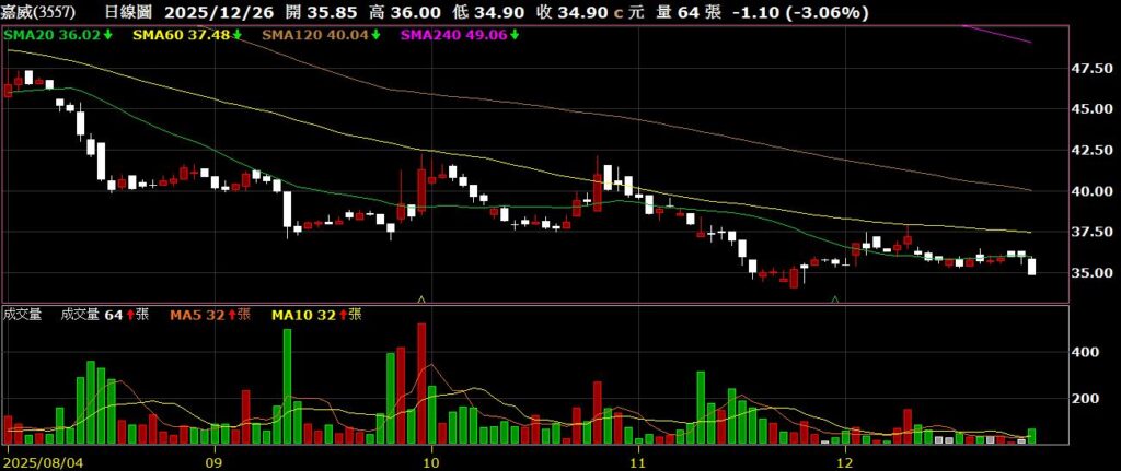 嘉威(3557)生活餐具大廠,11月營收為2.48億,年減37.98%,股價回測前低