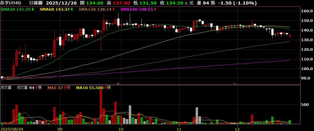 長亨(4546)飛機引擎零組件製造商,11月營收為1.76億,年增28.87%,股價拉回橫盤整理