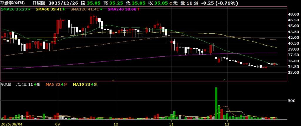 華豫寧(6474)MCU代理與電子鎖公司,11月營收為2.98億,年減8.22%,股價落底後反彈,挑戰月線