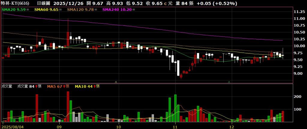 特昇-KY(6616)家具製造商,11月營收為8064萬,年減3.82%,股價挑戰半年線失敗,留下上影線