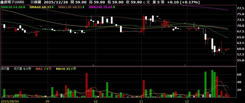 鑫創電子(6680)主要業務為智能車載電腦與嵌入式電腦,11月營收為4695萬,年減37.8%,股價落底後橫盤整理