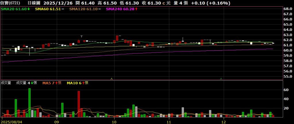 信實(6721)清潔保全公司,11月營收為3.06億,年增10.35%,股價橫盤整理