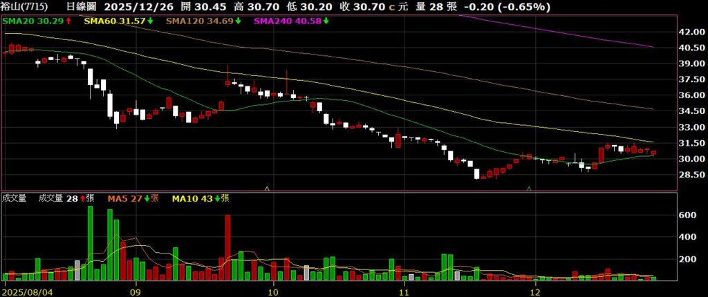 裕山(7715)環境工程公司,11月營收為1.07億,年減24.35%,為今年六月以來新高,股價重新站上月線