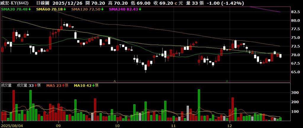 威宏-KY(8442)運動裝備及精品包袋製造商,11月營收為7.22億,年減0.99%,股價挑戰月線失敗
