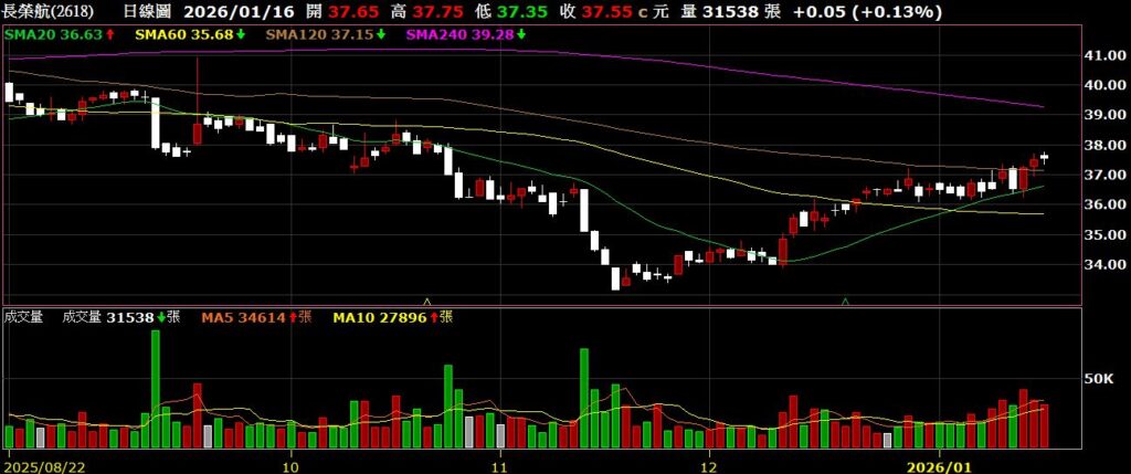 長榮航(2618)航空公司,12月營收為202.61億,年增1.03%,創歷史單月新高,股價站上半年線