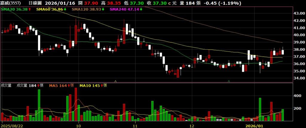 嘉威(3557)生活餐具大廠,12月營收為4.33億,年減9.4%,股價墊高站上季線