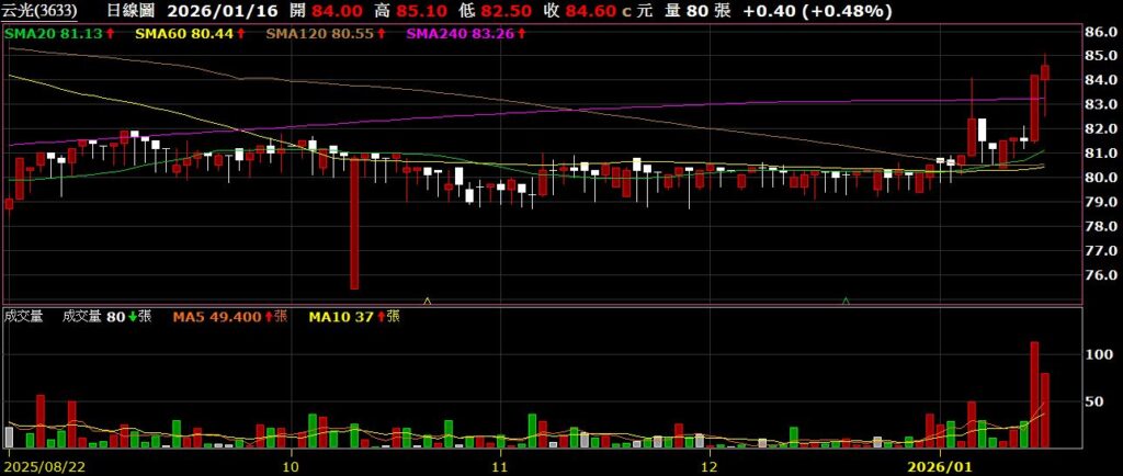 云光(3633)背光模組廠,12月營收為4.57億,年增7.63%,股價再度挑戰年線,創波段高