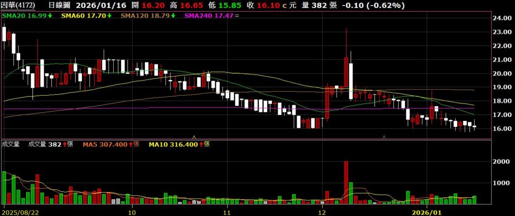 因華(4172)興櫃新藥股,股價持續低迷,回測12月低點
