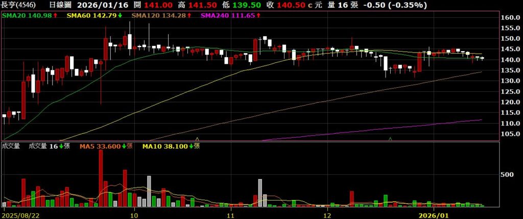 長亨(4546)飛機引擎零組件製造商,12月營收為1.85億,年減5.68%,股價季線橫盤整理