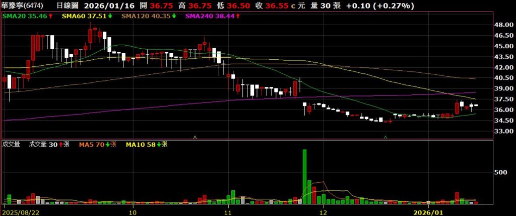 華豫寧(6474)MCU代理與電子鎖公司,12月營收為3.16億,年減11.83%,股價沿著月線橫盤整理