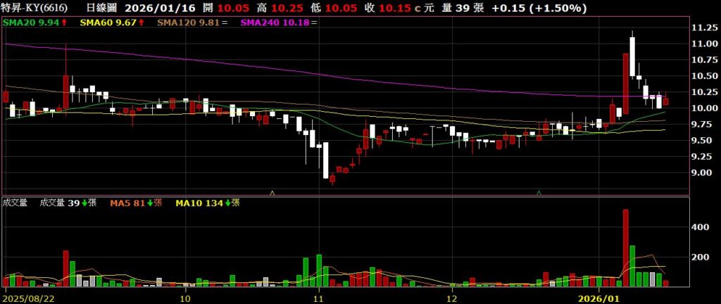 特昇-KY(6616)家具製造商,12月營收為8465萬,年減29.61%,股價創波段高後回測月線